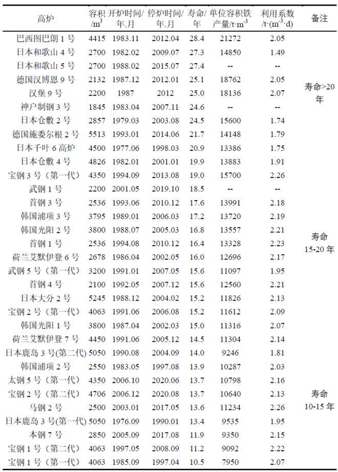 高爐作為一個密閉高溫高壓的“黑匣子”,內部發生著復雜多變的物理化學變化,高爐爐缸的侵蝕不可避免。近些年,國內多家鋼鐵企業高爐出現爐缸側壁溫度異常升高的現象,高爐異常侵蝕造成的安全事故頻發,尤其是發生了多起高爐爐缸燒穿事故,使得高爐安全高效生產變得愈發困難。國外先進高爐一代爐役(無中修)壽命可達15年以上,其中巴西圖巴朗1號高爐運行壽命達到了28.4年。而我國的高爐長壽水平與主流的高爐長壽目標尚有一定差距,一般一代爐役(無中修)壽命低于10年,僅部分高爐實現10~15年的長壽目標。表1為國內外長壽高爐壽命對比,可以知道國內高爐安全長壽運行技術有待提高。