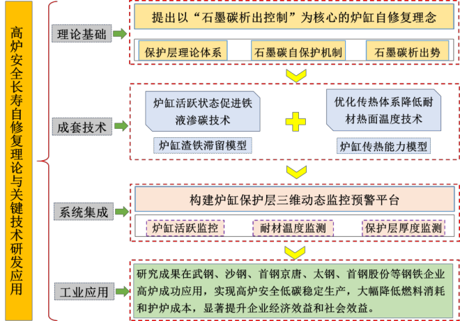 保障高爐安全長壽冶煉主要存在四大技術難點,即傳統護爐方法效果不理想,爐缸長壽基礎理論薄弱,爐缸長壽維護措施經驗化以及爐缸保護層監控手段缺失?;谝陨想y題,近20年來,項目組基于20余座高爐破損調查及高爐解剖研究,建立了爐缸保護層理論體系,揭示了爐缸耐火材料熱面石墨碳析出的自保護機制,通過“石墨碳析出勢”對爐缸石墨碳護爐進行定量化診斷,并從調控爐缸活躍狀態以促進鐵水滲碳,和優化爐缸傳熱體系以降低耐火材料熱面溫度兩個方面實現高爐爐缸的自修復,并建立了高爐爐缸保護層三維可視化監控預警平臺,其技術路線如圖2所示。