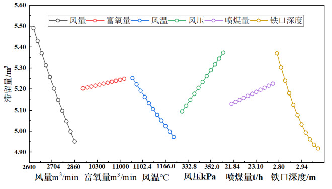 在表征方法方面,項目組首次研發了高溫渣鐵穿焦實驗裝置,模擬高爐爐缸渣鐵協同穿過焦炭層的滴落過程,提出了以渣鐵滯留表征高爐爐缸活性的新方法,并建立了爐缸渣鐵滯留率和滯留量模型,定量計算了多變量非線性高爐操作制度關鍵參數對爐缸活性的影響規律及影響權重。