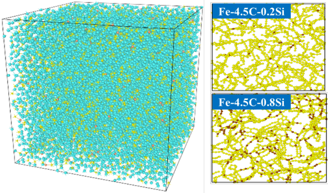 在操作調控方面,項目組開發了包括原燃料粒度及性能管控、高風速大動能、渣鐵流動控制及渣鐵排放管控的爐缸活躍狀況調控的系列技術,促進鐵液滲碳,提高鐵液碳飽和度,為爐缸自修復奠定基礎。在鐵焦滲碳方面,通過高溫實驗和分子動力學模擬,明晰了鐵液滲碳路徑及鐵液組分對鐵液滲碳的作用機制,明確促進鐵液滲碳的影響因素。即增加焦炭灰分中堿性物質,改善焦炭灰分流動性,增大鐵液-焦炭界面的有效接觸面積等,提高鐵液滲碳速率。適當提高鐵液中Si、Ti含量,降低S、Mn、P含量,提高鐵液碳飽和度。