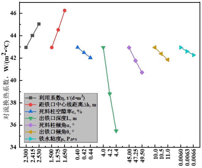 項目組同時提出了一種計算高爐爐缸鐵液對流換熱系數的新方法,以及鐵液對流換熱系數與各生產參數的量化關系方程,明晰不同生產參數對爐缸耐材熱面溫度影響規律及權重,為耐材熱面溫度控制指明方向。