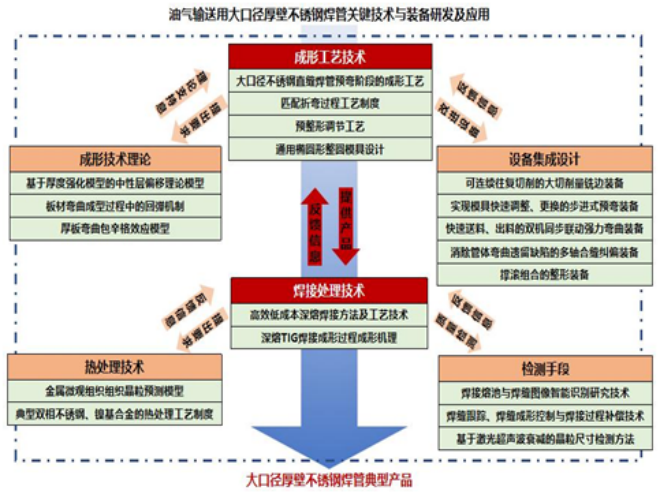 項目團隊經過十多年的聯合攻關,解決了成形與焊接的問題,在此基礎上輔助制備工藝、熱處理技術以及與之匹配的裝備。構建彎曲成形、連續焊接協同加工體系,解決管體成形與焊接性能一致性的問題,融合合理的工藝制度、熱處理技術以及與之匹配的裝備,制備出滿足市場需求的大口徑厚壁不銹鋼直縫焊管。其總體思路如圖1所示。