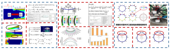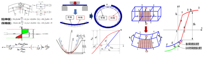 創新點一、基于厚壁板材中性層偏移、彎曲回彈、包辛格效應理論,構建了獲得板邊預彎、管體連續折彎與精整成形方法,為工藝制定和裝備研發提供了理論依據,形成不同規格產品單道次折彎過程中性層偏移量(板厚6%-18%)、回彈(板厚0.8%)等精準控制,解決了管體折彎成形過程尺寸偏差與缺陷難題。