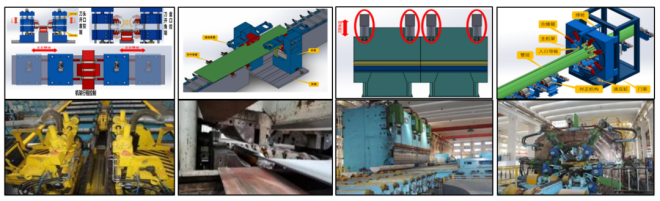 創新點五、研制出大口徑厚壁不銹鋼焊管成套裝備,構建了非對稱布置的板邊預彎、管體連續折彎等關鍵結構形式,實現了工藝與設備的集成創新,形成Φ219-Φ1219mm、壁厚80mm、長度12500mm系列產品生產技術,效率提高2倍以上。
