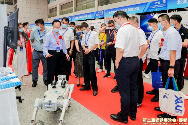 第二屆中國(guó)鋼鐵產(chǎn)業(yè)鏈邯鄲新技術(shù)新裝備展洽會(huì)上,代表們參觀智能機(jī)器人表演