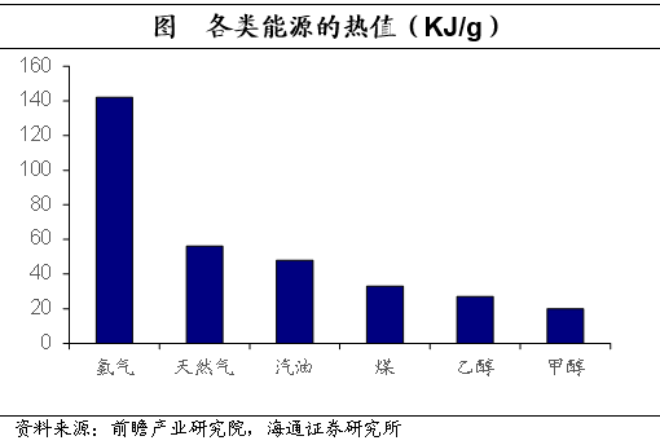 從應用端來看,氫能的優勢在于高效、應用廣泛。一是高效,相對于其他常見能源,氫氣燃燒的熱值更高,能達到142KJ/g,遠高于其他能源,從而能夠提升效率。二是氫氣的應用廣泛,既可以用作燃料電池發電,應用于汽車,船舶和航空領域,也可以單獨作為燃料氣體或化工原料進入生產,同時還可以在天然氣管道中摻氫燃燒,應用于建筑供暖等。目前在已經規模化應用的能源中,僅有石油能具備供熱、供電、交通燃料等多種功能,而氫氣無疑又是一種具有多種能源特性、適用多種場景的優質能源。