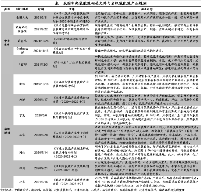 在我國,2021年9月22日,中央碳達峰、碳中和“1+N”政策體系中首個頂層設計文件《關于完整準確全面貫徹新發展理念做好碳達峰碳中和工作的意見》,著重提到了“統籌推進氫能‘制儲輸用’全鏈條發展”,“推動加氫站建設”,“推進可再生能源制氫等低碳前沿技術攻關”,“加強氫能生產、儲存、應用關鍵技術研發、示范和規模化應用”等氫能源產業的重要舉措。與此同時,各地政府也將氫能領域作為實現“雙碳”目標的重要抓手。