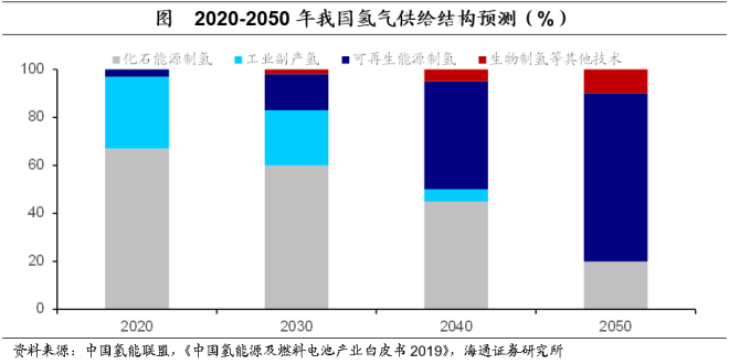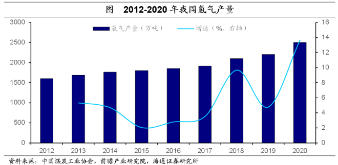 氫能需求的增長,勢必帶來生產端的增長。前文提到,根據中國煤炭工業協會的統計口徑,2012-2020年,我國氫氣產量的年均增速約為5.7%,呈現穩步增長趨勢,預計下一階段生產增速將略有提高,以滿足日益增長的國內消費和出口需求。根據中國氫能協會在2019年《中國氫能源及燃料電池產業白皮書》中的預測,氫能產業鏈產值在2050年將達到從2019年的3000億元增加至12萬億元,年均增速12.6%。而在考慮“碳達峰、碳中和”的目標后,預計實際增速還將高于此。