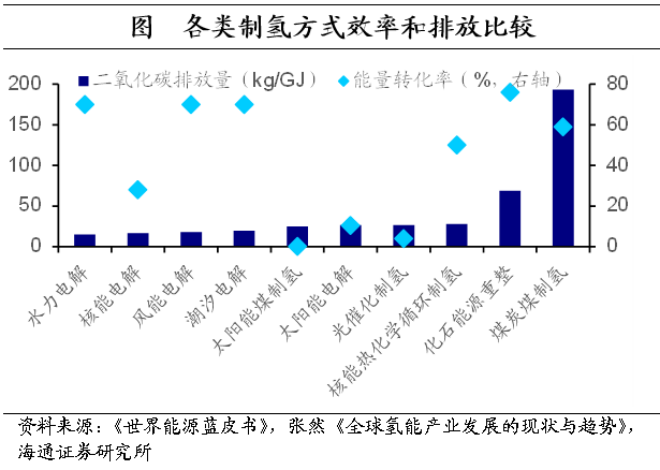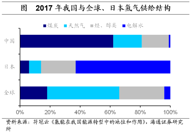 中國當前煤化工行業發展較為成熟,2016年我國煤制氫占比高達62%,相比來看,全球水平氫氣供給中僅有18%為煤制氫,而在氫能產業最為發達的日本,其煤制氫的比重僅為6%,電解水制取的綠氫占比高達63%。在以煤炭作為制氫主要來源的情況下,碳排放水平相比直接使用煤炭所差無幾,無法達到低碳的要求,所以當前我們面臨的一個難點是需要加大研發和應用綠氫制造技術的比例。