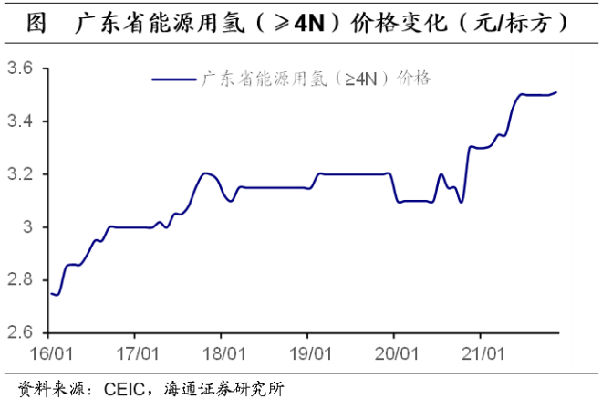 二是制取、儲運技術薄弱,綠氫價格短期或將較高。從縱向比較上看,我國僅有廣東省公布了自2016年以來能源用氫的價格,可以看到近年來一直保持上漲的趨勢。從橫向比較上看,2021年上半年,德國氫氣價格為74.4元/公斤,美國為106.35元/公斤,日本為70元/公斤,而中國僅為60-70元/公斤。
