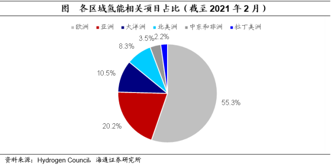 目前我國也是全球發展氫能速度較快的國家之一,在截至2021年初全球投資的氫能項目中,我國占比較高。據國際氫能協會統計,全球氫能產業鏈上已建成、在建和規劃項目共228個,主要分布在歐洲、澳大利亞、亞洲、中東、智利等國家和地區。從地域分布來看,預計歐洲的投資份額最大(約45%),其次是亞洲,而中國占亞洲總投資的50%左右,居首位。