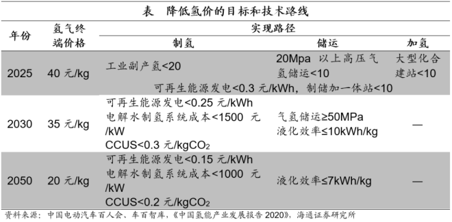 其次,在當前技術條件下,我國氫能終端消費價格高于其他能源,要推廣氫能的使用,就要實現綠氫平價。中國氫能聯盟專家委員會主任余卓平分析,如果到2025年我國風電、光伏的新增裝機發電成本降低到0.3元/千瓦時,綠氫成本將降到約25元/千克,能夠與天然氣制氫進行競爭。等2030年可再生能源發電成本降低到0.2元/千瓦時后,綠氫成本將低至15元/千克,可以與現在化石能源加上碳捕集技術制氫的價格進行競爭。《中國氫能產業發展報告2020》則給出了到2025、2030和2050年降低氫價至40、35、20元/千克的實現路徑表,可以看出,要使得氫能終端價格有所降低,需要依靠上游制氫、儲運、加氫多環節的整合。