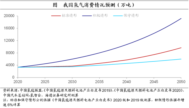首先,從總量來看,氫能需求預計將保持年均3.5%左右的增速,成為我國能源體系的重要組成部分。根據行業權威機構中國氫能聯盟預計,到2030年碳達峰情景下,氫能在中國終端能源體系的占比將從2019年的2.7%提高到6%,而到2060年碳中和情景下,這一比重將提高到20%。這對應著我國對氫氣的年需求量,從2020年的3342萬噸,增長至2030年和2060年的3715萬噸和1.3億噸,年均增速約為3.5%。這一目標相較于該機構2019年制定的,未考慮“雙碳”目標下,年均增速2.0%的方案更為積極。