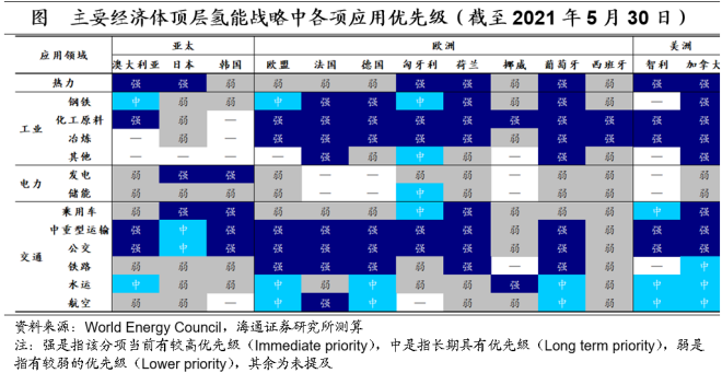 而在當前全球各主要經濟體提出的頂層氫能戰略中,最受關注的應用領域是化工、冶煉、中重型運輸和公交。這說明,這些是在當前最具有緊迫性,也更具有可行性的技術應用領域,也是未來我國在氫能綜合應用中更應關注和突破的方向。