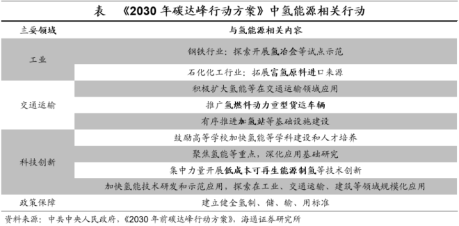 為了實現在供給端平價和需求端廣泛應用的目標,當前哪些氫能源產業領域和賽道更值得關注?首先,我們可以參考政府報告中提到的重點技術領域,《2030年碳達峰行動方案》中提到了多項與氫能源相關的行動,如氫冶金試點、推廣氫燃料動力車輛、推進加氫站建設、創新低成本可再生能源制氫技術等。而在工信部發布的《“十四五”工業綠色發展規劃》中,也提到了發展可再生能源電解制氫技術,氫燃料燃氣輪機、超高壓氫氣壓縮機、高效氫燃料電池等新能源裝備,綠氫煉化等降碳技術等方向。