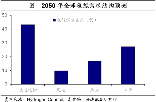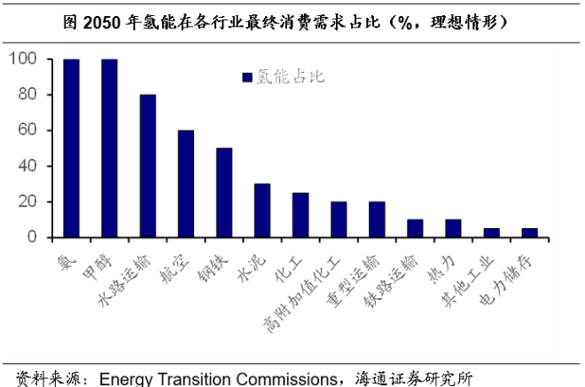 對比國際上的路線圖,我們預計實際增速可能高于此,或將在6%左右。國際能源署在《2050年凈零排放——全球能源部門路線圖》中預測,為實現在2050年碳中和,全球對氫氣的需求將從2020年的0.87億噸增長至5.3億噸,年均增長6.2%。而國際氫能委員會在2021年11月的報告《凈零氫能報告》中也提到,為實現碳中和、全球降溫1.5度的目標,到2050年,全球對氫氣的需求為6.6億噸,占全球最終能源需求的22%,年均增速達7.0%。這兩個目標均較國內機構要更積極,也就是說,如果碳中和的進程需要加快,氫能源行業發展也會進一步提速。