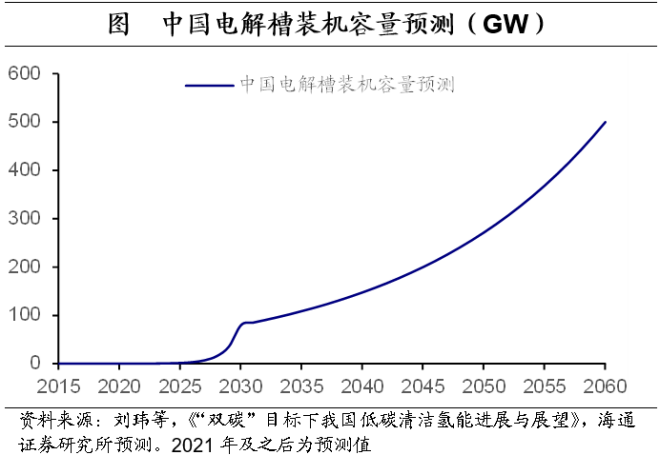 具體地,我們按產業鏈的上中下游分別尋找未來的焦點賽道。從生產端看,核心在于如何低成本制取零碳排放的綠氫,與此相關的賽道包括電解槽、催化劑、碳捕集和封存(CCUS)等。其中,可以從低碳電力和水中產生干凈的氫氣,是未來增加綠氫供給的核心。近年來我國電解制氫項目及裝機容量增速較快,從2015年的1.63MW,增至2020年的23.47MW,年均增速高達70.5%。要實現到2030年和2060年綠氫占比達13.5%和76.9%的目標,分別需要部署電解槽裝機80GW和500GW,這意味著在2020-2030年間要保持年均125.6%的超高增速,而在2030年后,年增速逐步趨于正常。