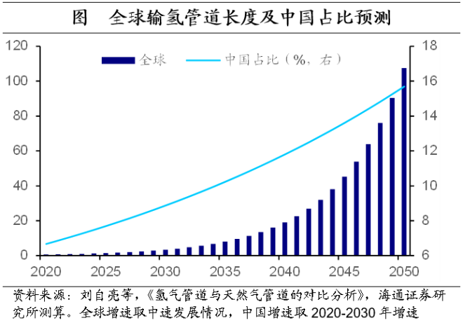在儲運的基礎設施上,氫氣管網建設有較大的發展空間。工業氫氣運輸主要以管道形式為主,低壓管道運氫適合大規模、長距離的情況,在未來有極大的需求。全球在2020年共建成輸氫管道6000公里,其中,中國僅有400公里,占比為6.7%。而根據劉自亮等的研究,預計在中速發展的情況下,到2050年全球將建成長距離和短距離輸氫管道7.5萬和100萬公里,年均增速約為18.9%。中國預計到2030年將建成氫氣管道3000公里,年均增速為22.3%,較全球增長更快。