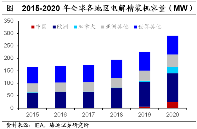 而且我國制備氫氣的資源很豐富,棄電資源能作為氫能供給的重要來源。中國是全球第一大可再生能源發電國,截至2020年底,中國可再生能源發電裝機總規模達9.3億千瓦,占全球總量的80%以上。我國每年在風電、光伏、水電等可再生能源上的棄電約1000億千瓦時,可用于電解水制氫約200萬噸,可再生能源有望成為中國綠氫供給的主要來源。
