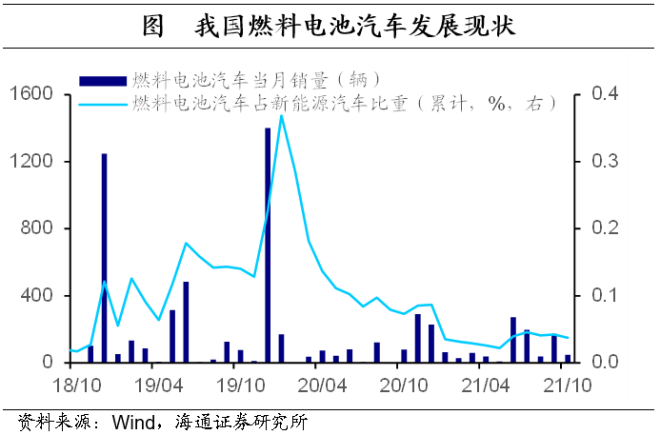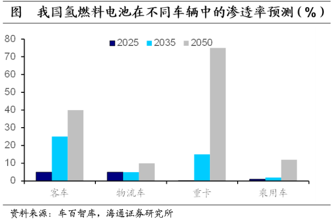 氫燃料電池在交通運輸行業中的應用是未來的重要增長點。目前我國燃料電池汽車占新能源汽車銷量的比重最高也不超過0.4%。其中,截至2020年8月,燃料電池車主要以物流車和客車為主,乘用車占比僅為0.1%,且主要用于租賃。根據車百智庫的預測,氫燃料電池汽車保有量將在2025、2035和2050年分別達到10萬、100萬和3000萬輛,年均增速約為25.6%,主要應用于重卡、客車等大型車輛中,在乘用車中的滲透率也將提高到12%。
