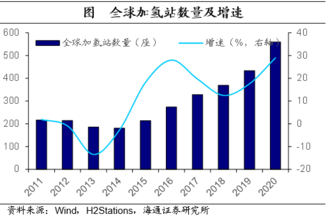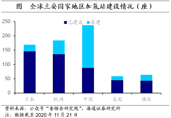 而氫燃料汽車的廣泛應用,還需要基礎設施,如加氫站的配套建設。截至2020年底,全球共建成加氫站約544座,其中我國128座,占比約為23.5%。根據《中國氫能與燃料電池白皮書(2019)》預測,我國加氫站數量在2035年將達到1500座,在2050年將達到10000座以上,為實現這一目標,加氫站數量的年均增速達15.6%。而根據香橙研究會統計的情況,當前我國加氫站建設的速度在全球領先,在建數量遠超其他國家和地區,可以預見在近期,我國將繼續推進氫能基礎設施領域建設。
