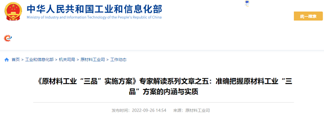 近日,中華人民共和國工業和信息化部網站發布了《原材料工業“三品”實施方案》專家解讀系列文章:準確把握原材料工業“三品”方案的內涵與實質。