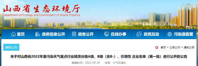 近日,山西省生態(tài)環(huán)境廳發(fā)布了《關(guān)于對(duì)山西省2022年重污染天氣重點(diǎn)行業(yè)績(jī)效分級(jí)A級(jí)、B級(jí)(含B-)、引領(lǐng)性企業(yè)名單(第一批)進(jìn)行公開的公告》(以下簡(jiǎn)稱《公告》)。