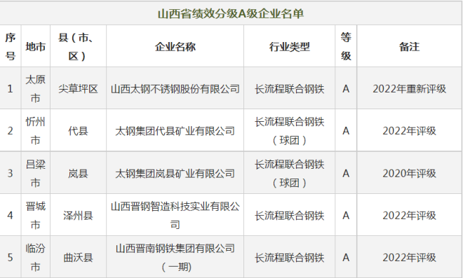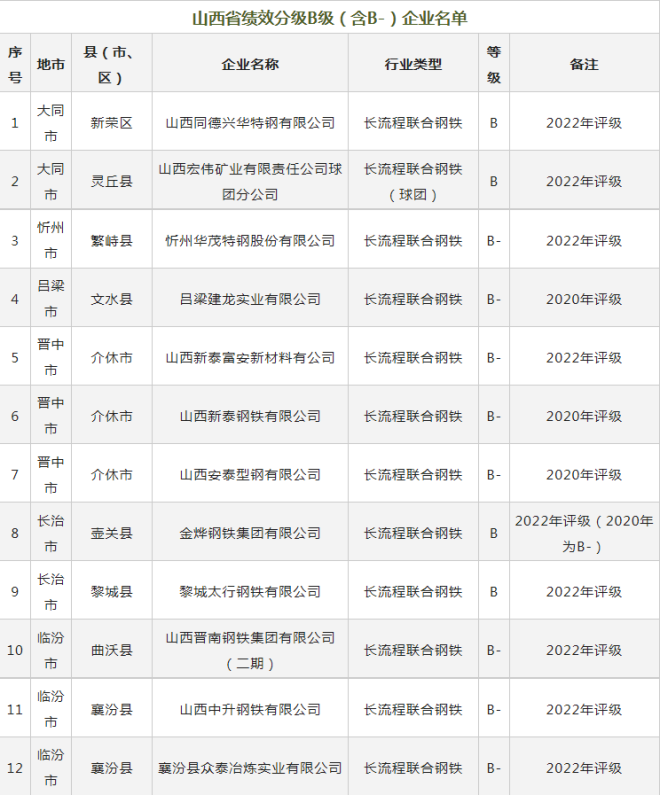 這些鋼企獲評(píng)山西2022年重污染天氣重點(diǎn)行業(yè)績(jī)效分級(jí)A級(jí)、B級(jí)(含B-)