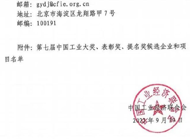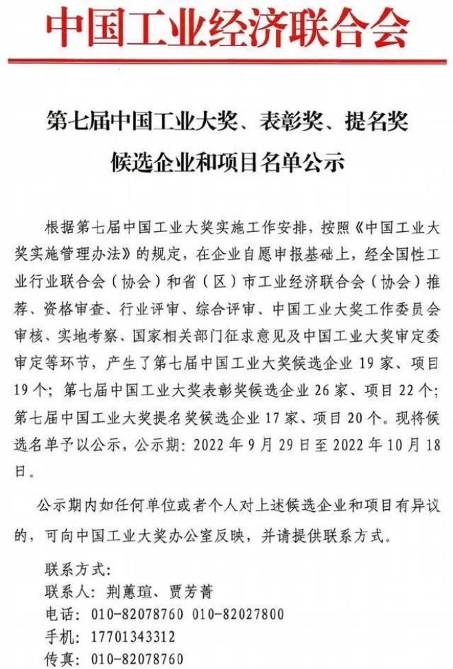 第七屆中國工業(yè)大獎、表彰獎、提名獎