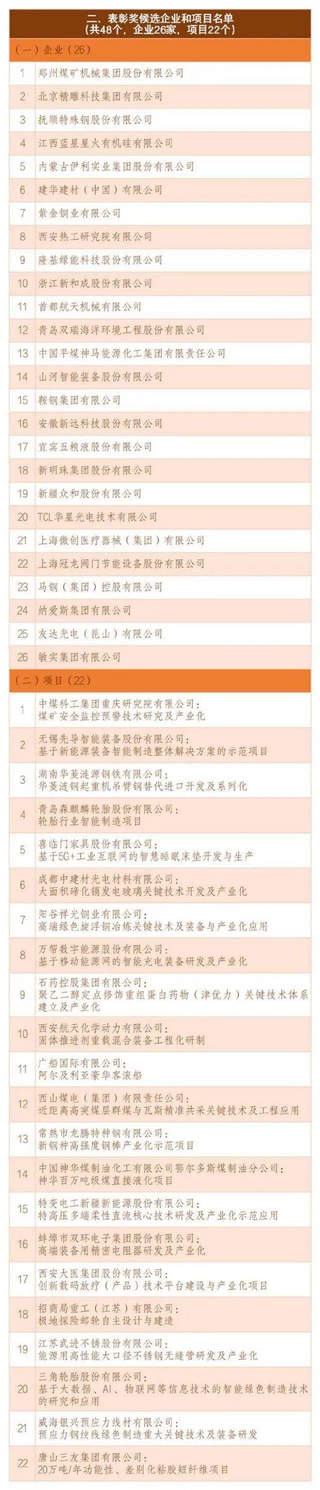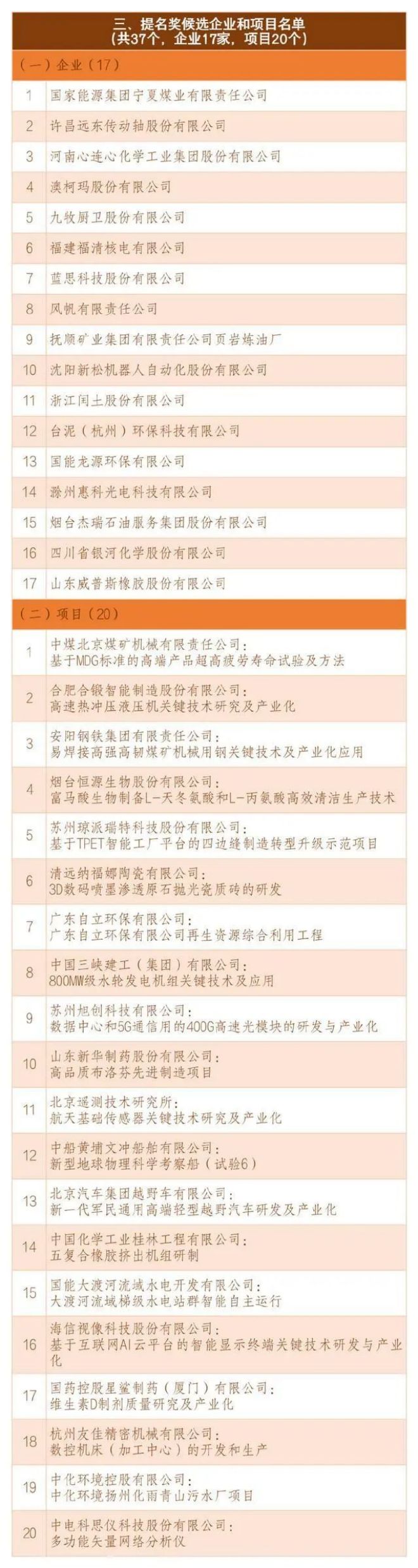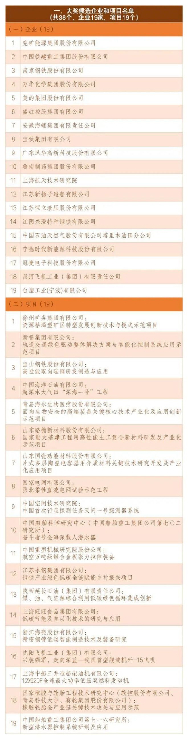 近日,第七屆中國工業(yè)大獎、表彰獎、提名獎候選企業(yè)和項目名單進行公示。根據(jù)第七屆中國工業(yè)大獎實施工作安排,按照《中國工業(yè)大獎實施管理辦法》的規(guī)定,在企業(yè)自愿申報基礎上,經全國性工業(yè)行業(yè)聯(lián)合會(協(xié)會)和省(區(qū))市工業(yè)經濟聯(lián)合會(協(xié)會)推薦、資格審查、行業(yè)評審、綜合評審、中國工業(yè)大獎工作委員會審核、實地考察、國家相關部門征求意見及中國工業(yè)大獎審定委審定等環(huán)節(jié),產生了第七屆中國工業(yè)大獎候選企業(yè)19家、項目19個,第七屆中國工業(yè)大獎表彰獎候選企業(yè)26家、項目22個,第七屆中國工業(yè)大獎提名獎候選企業(yè)17家、項目20個。