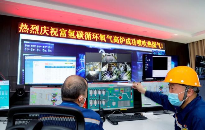 八鋼富氫碳循環高爐一期于2020年7月15日正式投運。2020年10月,平臺成功突破傳統高爐富氧極限,并實現第一階段鼓風含氧35%實驗目標。2021年2月,平臺二期工程開工建設。當年6月11日,平臺首次實現脫碳煤氣噴吹,成為全球首座噴吹脫碳煤氣的高爐。當年7月30日,平臺成功實現第二階段50%高富氧冶煉目標,其間部分時段高爐富氧率已超過50%,高爐燃料比較噴吹脫碳煤氣前基準期燃料比降低70kg/t。2022年8月8日,富氫碳循環高爐風口噴吹焦爐煤氣,成功開啟氫冶金實驗,并具備了減碳10%的工藝技術能力。三期試驗的投運,是鋼鐵冶金全面走向30%以上減碳目標的重要工藝技術創新的開端,也是推進鋼鐵行業實現低碳冶金技術創新的破題之舉,更是中國寶武引領世界鋼鐵冶金前沿技術發展的重大舉措。