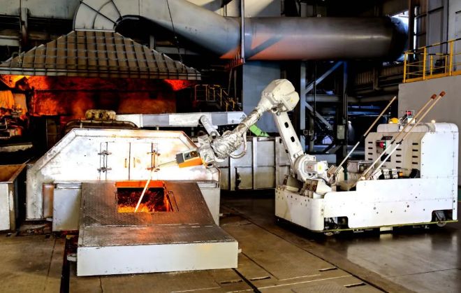 八鋼歐冶爐測溫機器人在進行測溫作業。(姚海山 攝)