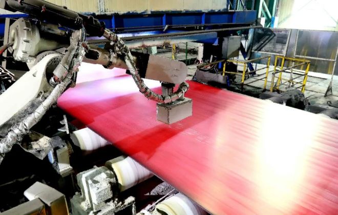 八鋼中厚板產線噴號機器臂在進行噴號作業。(姚海山 攝)