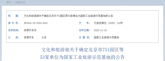 近日,中華人民共和國文化和旅游部網站發布了《文化和旅游部關于確定北京市751園區等53家單位為國家工業旅游示范基地的公告》(以下簡稱《公告》)。