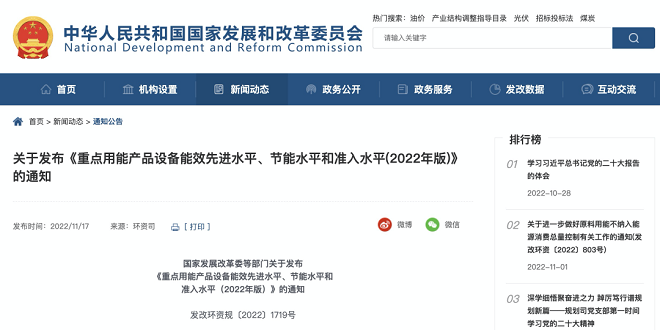 近日,國家發展和改革委員會網站發布了《重點用能產品設備能效先進水平、節能水平和準入水平(2022年版)》的通知(以下簡稱《通知》)。