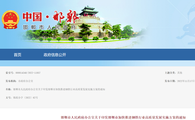 11月17日,邯鄲市人民政府網站發布了關于印發邯鄲市加快推進鋼鐵行業高質量發展實施方案(以下簡稱方案)的通知。