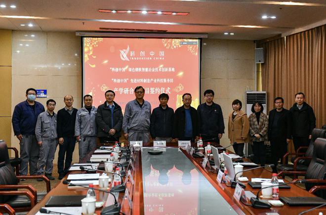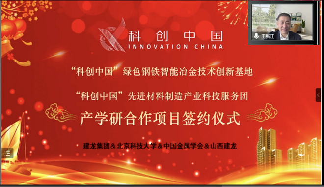 2022年11月19日上午,“科創中國”先進材料制造產業科技服務團助力科技成果轉化落地暨山西建龍集團、北京科技大學產學研融合項目簽約儀式以線上線下結合的方式舉行。“科創中國”山西掛點組副組長、中國科協辦公廳財務資產處處長周峰,中國金屬學會副理事長兼秘書長王新江,北京科技大學工程技術研究院副院長邵健,建龍集團戰略與品種開發部副部長陳克勤,山西建龍副總經理劉西峰,運城市科協黨組成員閆昌發等領導、企業科技人員參加了簽約儀式。