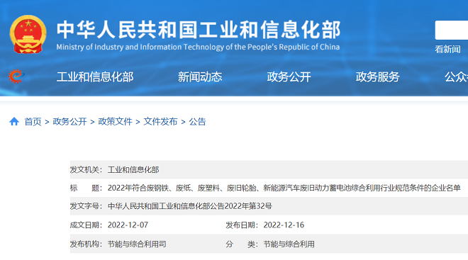 近日,工業和信息化部對符合《廢鋼鐵加工行業準入條件》企業名單(第十批)、符合《廢紙加工行業規范條件》企業名單(第一批)、符合《廢塑料綜合利用行業規范條件》企業名單(第六批)、符合《廢舊輪胎綜合利用行業規范條件》企業名單(第三批)、符合《新能源汽車廢舊動力蓄電池綜合利用行業規范條件》企業名單(第四批),以及變更、撤銷相關行業規范公告的企業名單予以公告。
