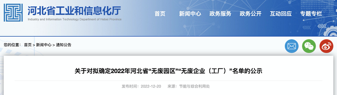 12月20日,河北省工信廳網(wǎng)站發(fā)布了《關(guān)于對擬確定2022年河北省“無廢園區(qū)”“無廢企業(yè)(工廠)”名單的公示》(以下簡稱《公示》)。