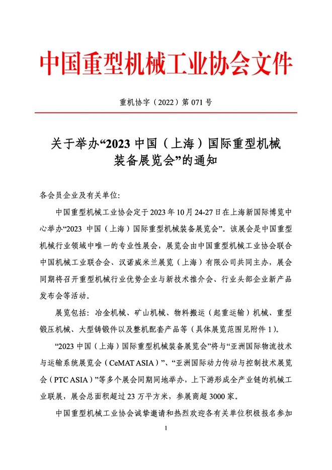 關于舉辦“2023中國(上海)國際重型機械裝備展覽會”的通知