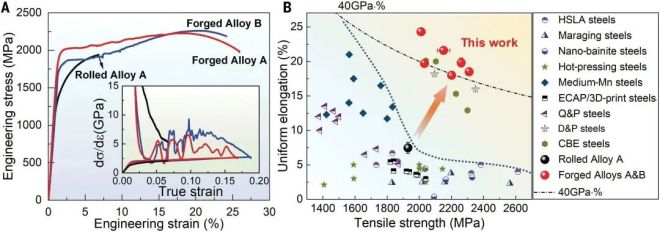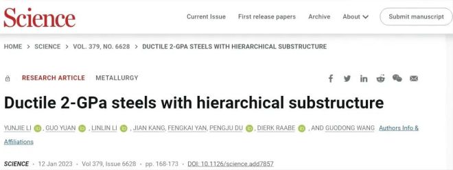 2023年1月13日,東北大學(xué)軋制技術(shù)及連軋自動(dòng)化國(guó)家重點(diǎn)實(shí)驗(yàn)室王國(guó)棟院士/袁國(guó)教授研究團(tuán)隊(duì)在國(guó)際頂級(jí)期刊Science上以“Ductile 2-GPa steels with hierarchical substructure”為題,發(fā)表了在超高強(qiáng)鋼鐵材料增塑機(jī)制及組織創(chuàng)新設(shè)計(jì)方面的最新研究成果。