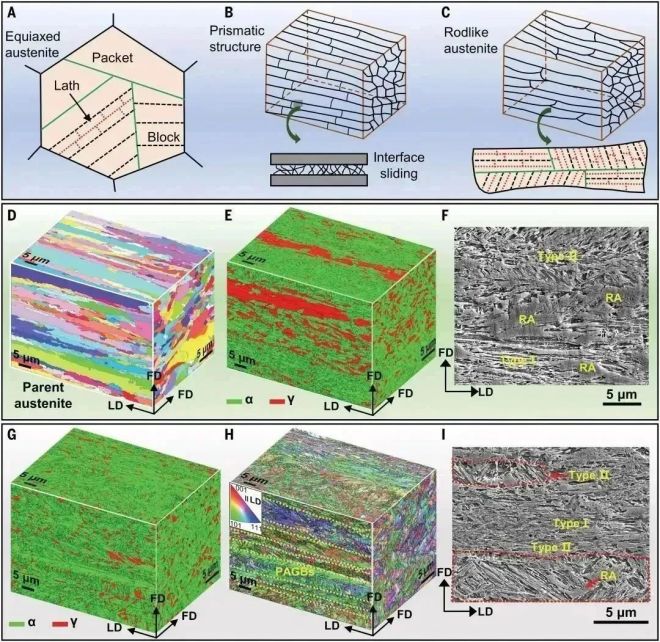 面對(duì)上述挑戰(zhàn),研究團(tuán)隊(duì)創(chuàng)新提出“馬氏體拓?fù)鋵W(xué)結(jié)構(gòu)設(shè)計(jì)+亞穩(wěn)相調(diào)控”協(xié)同增塑新機(jī)制,成功制備出系列低成本C-Mn系新型超高強(qiáng)鋼,打破了超高強(qiáng)鋼對(duì)復(fù)雜制備工藝和昂貴合金成分的依賴,也突破了現(xiàn)有2000 MPa級(jí)馬氏體高強(qiáng)鋼抗拉強(qiáng)度—均勻延伸率的性能邊界。同時(shí),提出簡(jiǎn)單高效的制備工藝路線,構(gòu)筑出一種全新的拓?fù)鋵W(xué)雙重有序排列的馬氏體和多尺度亞穩(wěn)奧氏體的納米級(jí)多層次組織結(jié)構(gòu)。該組織結(jié)構(gòu)通過(guò)在變形過(guò)程中誘發(fā)板條界面(in-lath-plane slip)位錯(cuò)滑移、界面塑性和相變誘發(fā)塑性(TRIP)等多種增強(qiáng)增塑機(jī)制,促使材料具有持續(xù)較高的加工硬化能力,大幅度提升其強(qiáng)度和塑性,實(shí)現(xiàn)了1600~1900 MPa屈服強(qiáng)度,2000~2400 MPa抗拉強(qiáng)度和18%~25%均勻延伸率的極致性能。