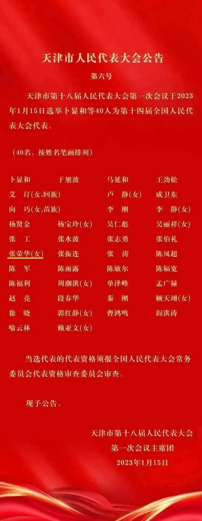1月15日,天津市第十八屆人民代表大會第一次會議選舉產(chǎn)生40名天津市出席第十四屆全國人民代表大會代表。中國民間商會副會長、全聯(lián)女企業(yè)家商會會長、天津榮程祥泰投資控股集團有限公司董事會主席張榮華光榮當選第十四屆全國人民代表大會代表。
