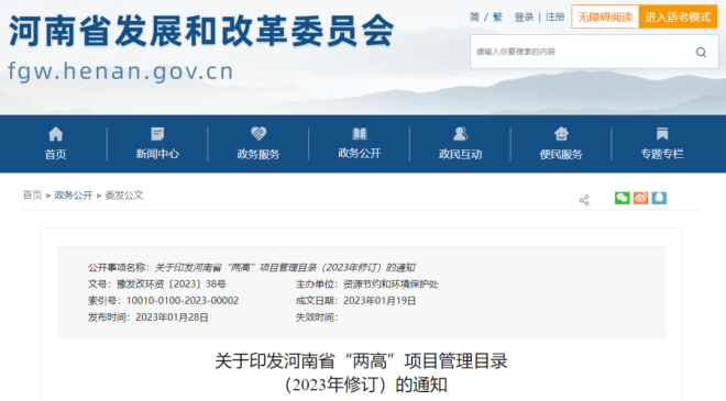 1月28日,河南省發展和改革委員會網站發布了《關于印發河南省“兩高”項目管理目錄(2023年修訂)的通知》(以下簡稱《通知》)。