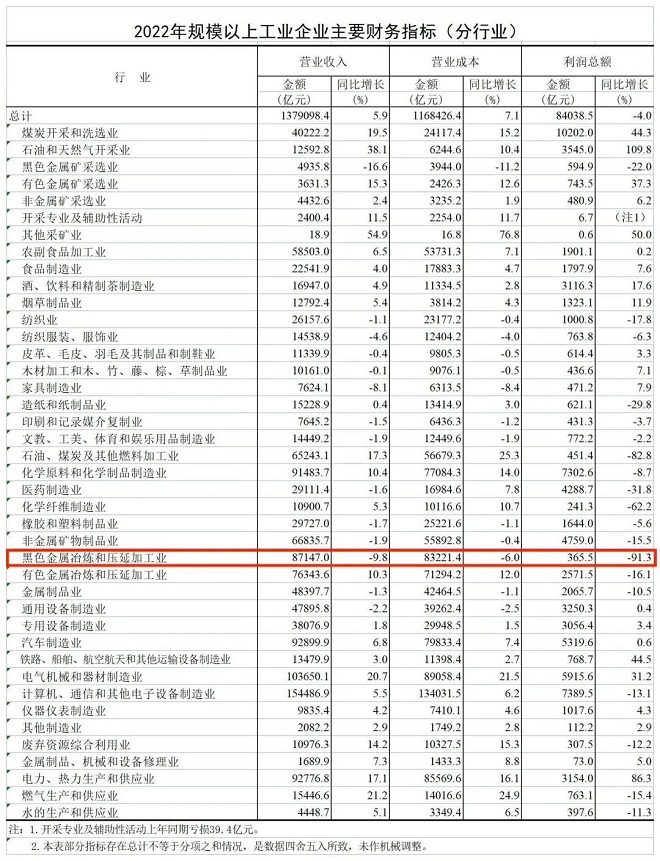 ↓91.3%!黑色金屬冶煉和壓延加工業(yè)成2022年利潤(rùn)下降幅度最大行業(yè)