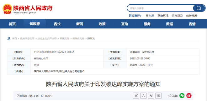 近日,陜西省人民政府網站發布了《陜西省人民政府關于印發碳達峰實施方案的通知》(以下簡稱《通知》)。
