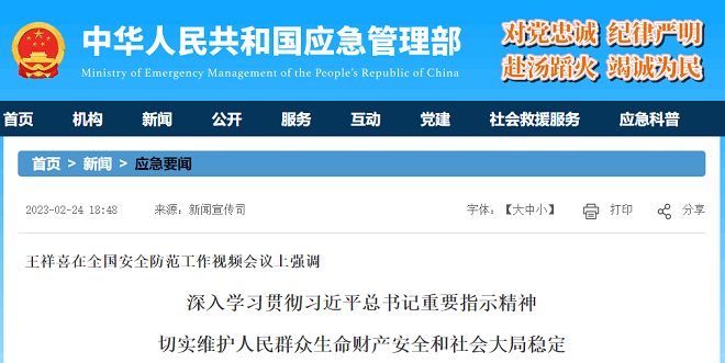 從中華人民共和國應(yīng)急管理部網(wǎng)站獲悉,2月24日下午,應(yīng)急管理部黨委書記、部長王祥喜主持召開全國安全防范工作視頻會議,強調(diào)要深入學(xué)習(xí)貫徹習(xí)近平總書記重要指示精神,按照李克強總理等領(lǐng)導(dǎo)同志批示要求,深刻吸取事故教訓(xùn),舉一反三全面排查整治重點行業(yè)領(lǐng)域重大安全隱患,堅決遏制重特大事故,切實維護人民群眾生命財產(chǎn)安全和社會大局穩(wěn)定,為全國兩會勝利召開創(chuàng)造良好的安全環(huán)境。