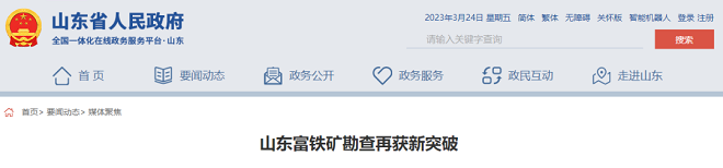 3月22日,山東省人民政府網站發布了《山東富鐵礦勘查再獲新突破》一文。