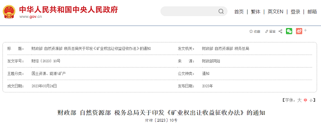 財政部、自然資源部、稅務總局有關負責人表示,礦業權出讓收益制度既關系到礦產資源國家所有者權益,又關系到礦山企業的切身利益。健全完善礦業權出讓收益制度,是嚴守資源安全紅線底線,推動戰略性礦產資源增儲上產,增強維護能源資源、重要產業鏈供應鏈安全的一項重要舉措。