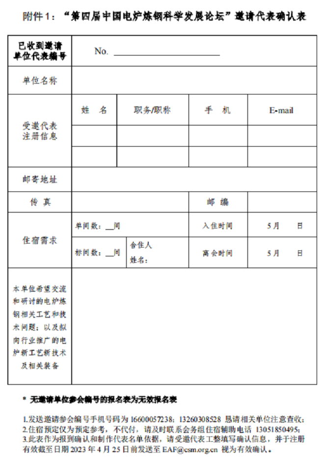附件1 “第四屆中國電爐煉鋼科學發展論壇” 邀請代表確認表